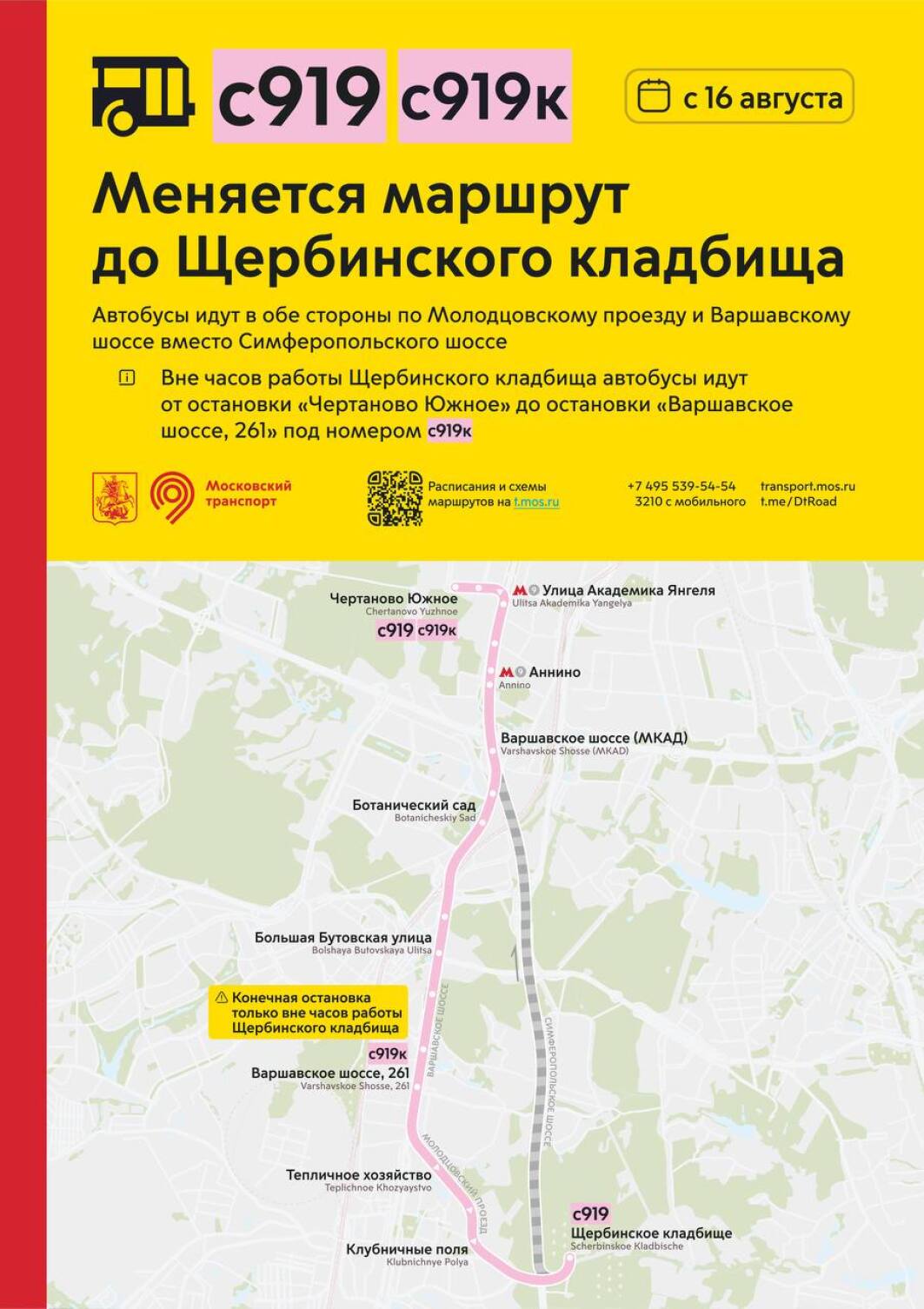 Вне часов работы Щербинского кладбища автобусы пойдут от остановки «Чертаново Южное» до остановки «Варшавское шоссе, 261» под номером с919к.