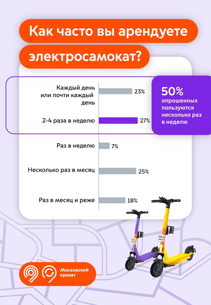 🔹 50% пользователей ездят на самокатах несколько раз в неделю или чаще.