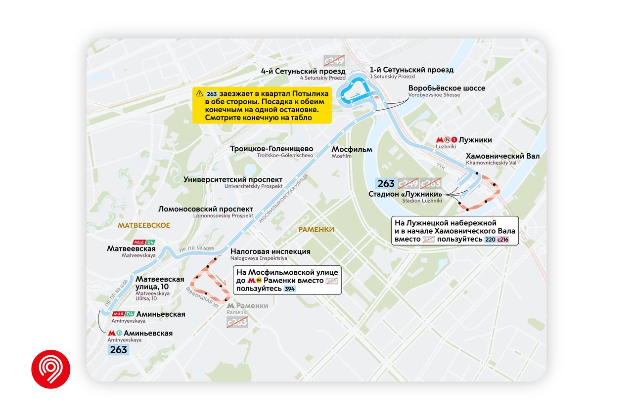 🔹 Заработает новый маршрут 263 вместо маршрутов с249 и с263. Транспорт здесь будет ходить чаще, а у жителей Матвеевского и Раменок, а также с Мосфильмовской улицы появится новый удобный путь до МЦК, МЦД и Большой кольцевой линии.