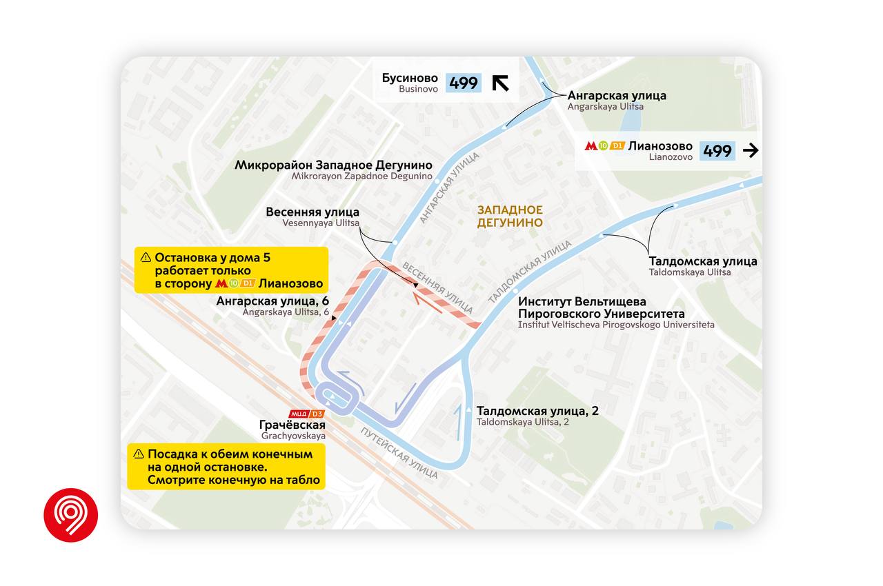 🔹 Маршрут 499 пойдет в обе стороны по Путейской улице вместо Весенней улицы. Автобусы будут быстрее подъезжать к МЦД Грачевская.