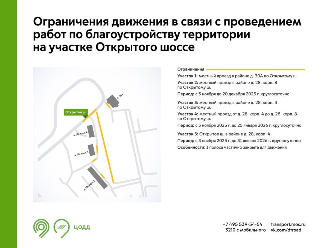 В период с 3 ноября 2025 г. до 31 января 2026 г. будет недоступна для движения 1 полоса на участках Открытого шоссе и местных проездов в районе дома 30А, а также 3, 4, 8 корпусов дома 28 по Открытому шоссе. Это связано с проведением работ по благоустройству территории.