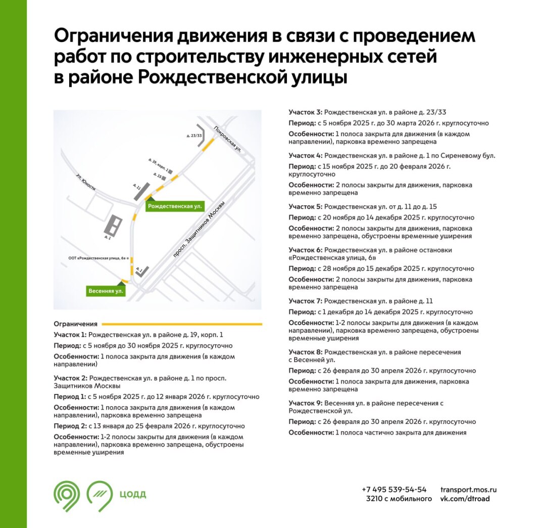 С 5 ноября 2025 г. до 30 апреля 2026 г. на участках Рождественской улицы будут недоступны для движения 1-2 полосы. Это связано с проведением работ по строительству инженерных сетей.