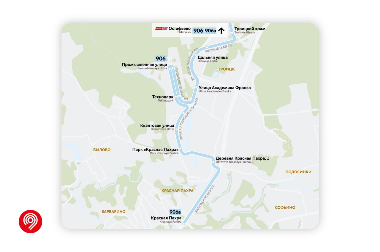 🔹 Дополнительные рейсы у маршрута 906а. Они будут работать в будни в часы пик, благодаря чему работникам промзоны и технопарка Троицка станет удобнее пересаживаться на другие маршруты наземного транспорта на Калужском шоссе.