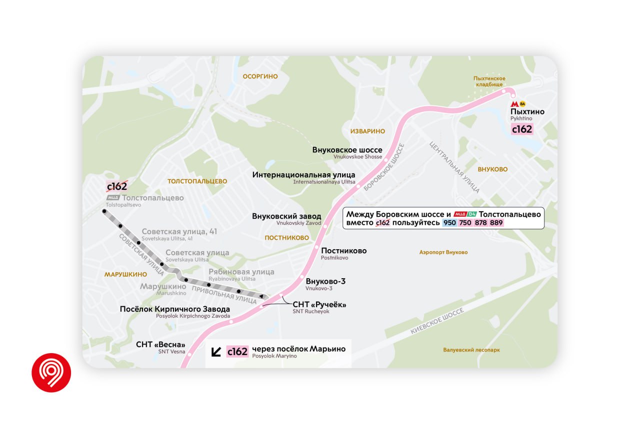 🔹 Автобусы с162 проследуют до метро «Пыхтино», вместо МЦД Толстопальцево. У жителей крупных жилых комплексов в ТиНАО появится удобная беспересадочная связь с Солнцевской линией метро.