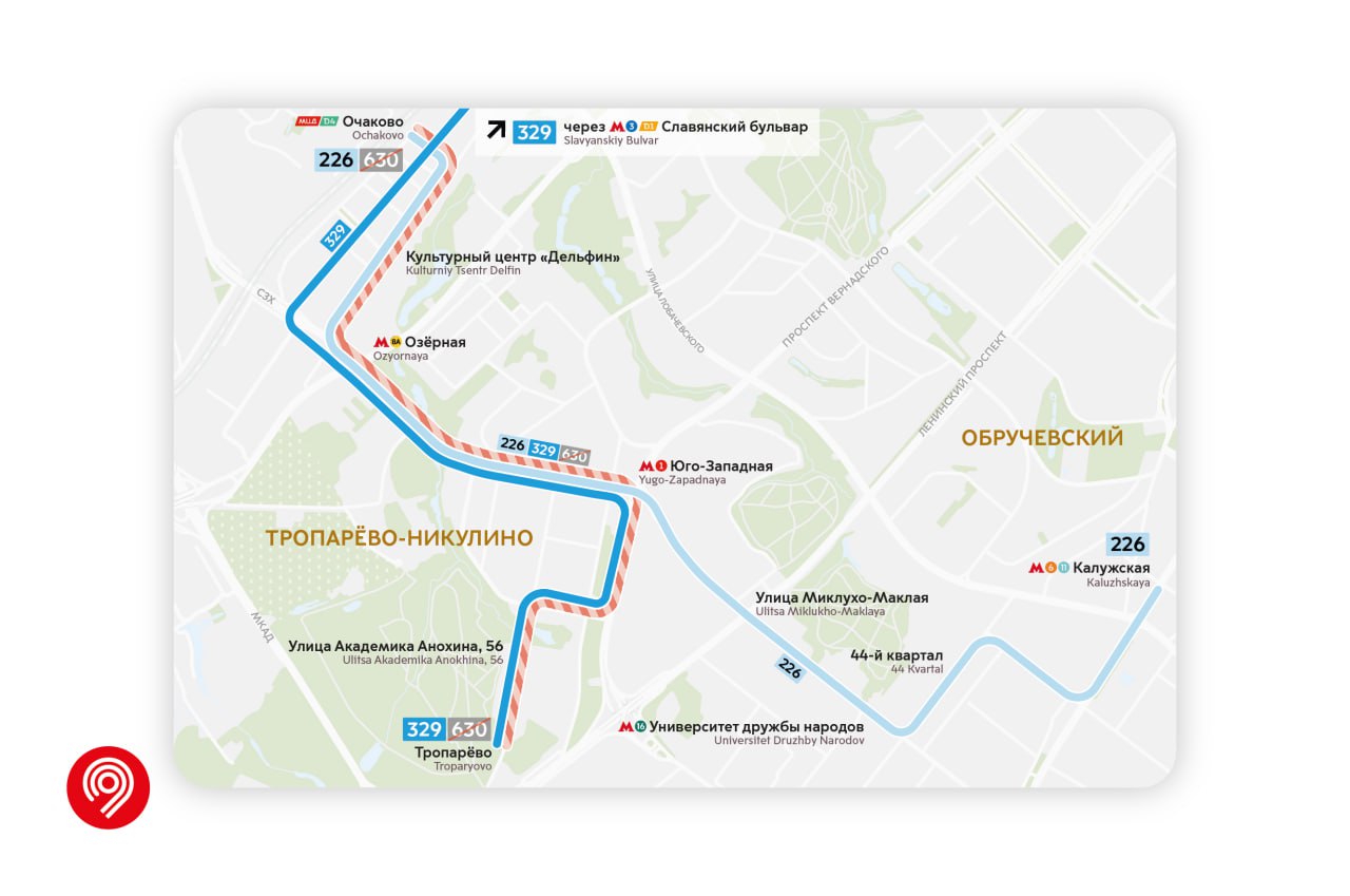 🔹 В Тропарево-Никулино и Очаково-Матвеевском маршрут 630 станет частью маршрутов 226 и 329.