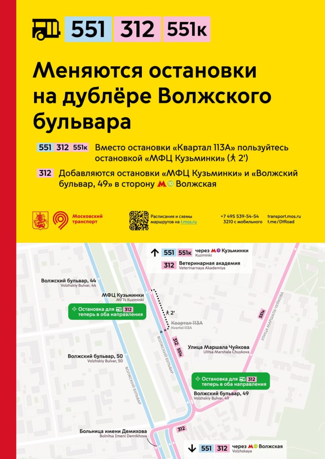 🔹 Для маршрутов 312, 551 и 551к вместо остановки «Квартал 113А» пользуйтесь остановкой «МФЦ Кузьминки».