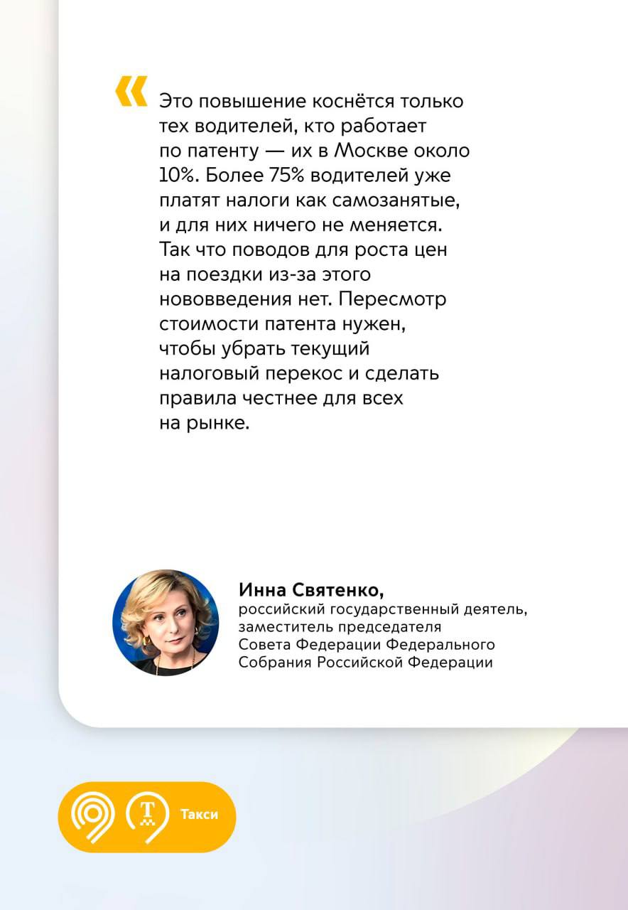 При этом в настоящее время 75% таксистов являются самозанятыми, и они в среднем уплачивают налог в размере 9 тыс. руб. в месяц. Поэтому стоимость патента с 2026 года составит также 9 тыс. руб. в месяц, что обеспечит выравнивание условий работы всех участников отрасли.