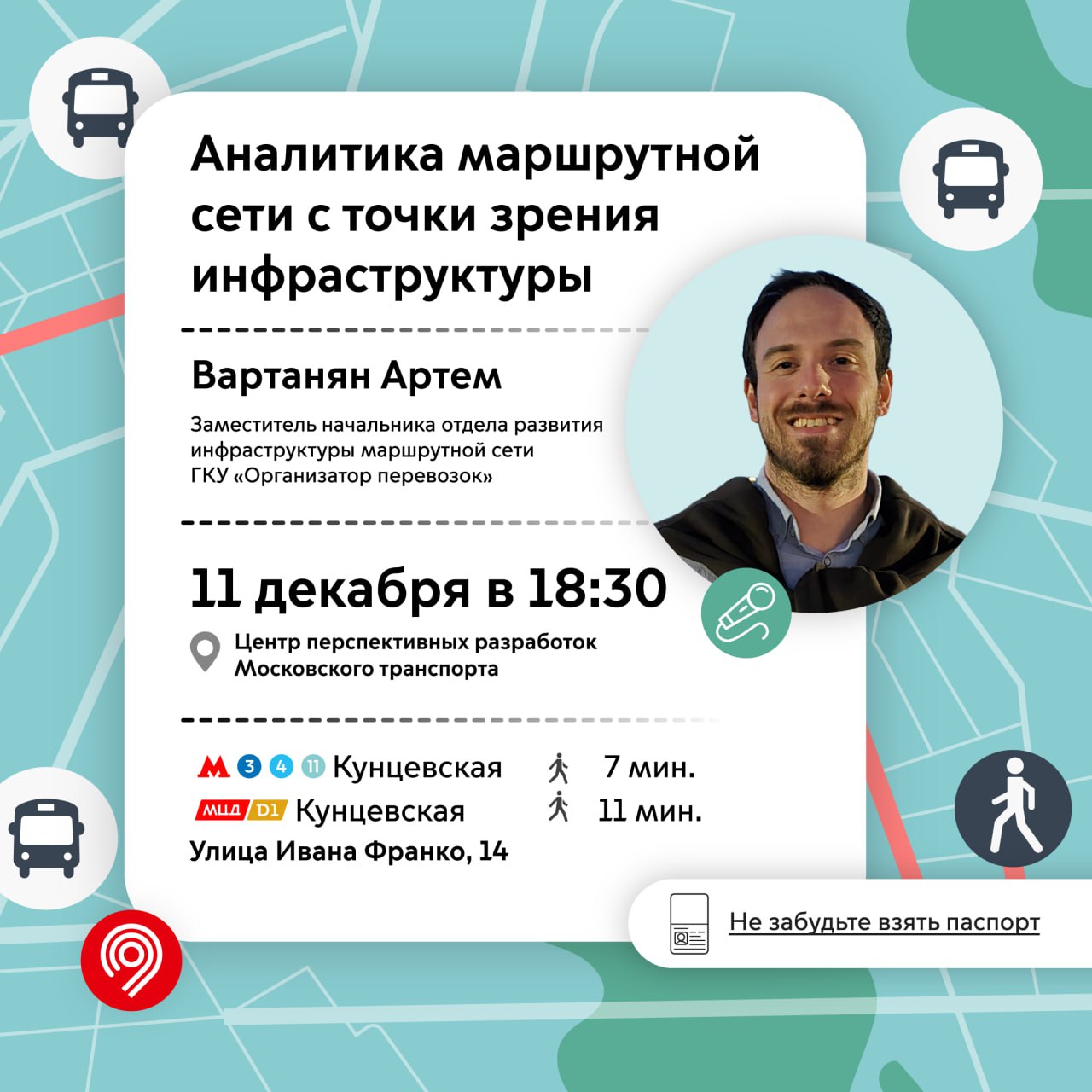 Познавательная встреча пройдет 11 декабря. Спикером выступит Артем Вартанян, заместитель начальника отдела развития инфраструктуры маршрутной сети ГКУ «Организатор перевозок».