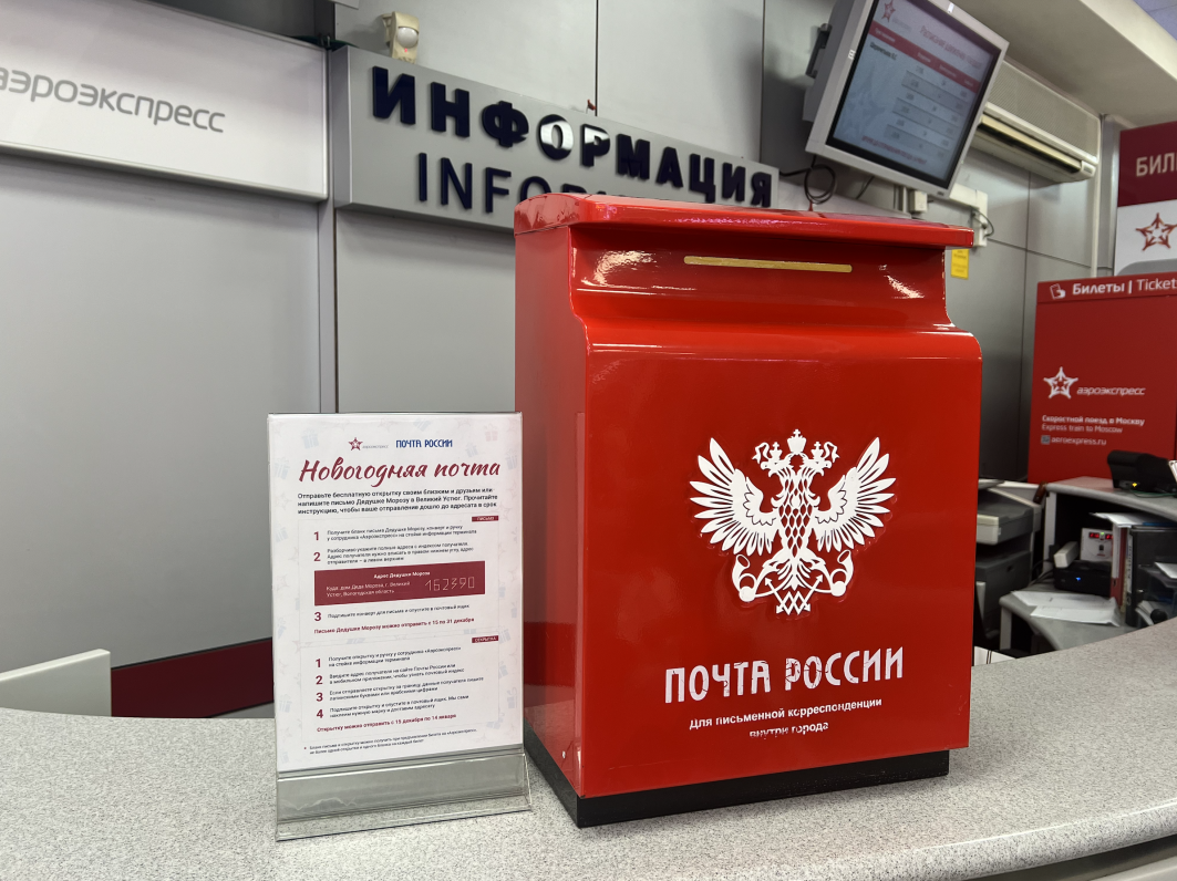 Специальные почтовые ящики для праздничных отправлений установлены на стойках информации в терминалах Аэроэкспресса на Белорусском вокзале и в Домодедово. Для получения открытки, бланка для письма и конверта нужно обратиться к сотрудникам стойки информации. Там же можно найти канцелярские принадлежности и подробную инструкцию по заполнению. После заполнения открытку/письмо необходимо опустить в почтовый ящик. Почта России доставит все послания бесплатно.