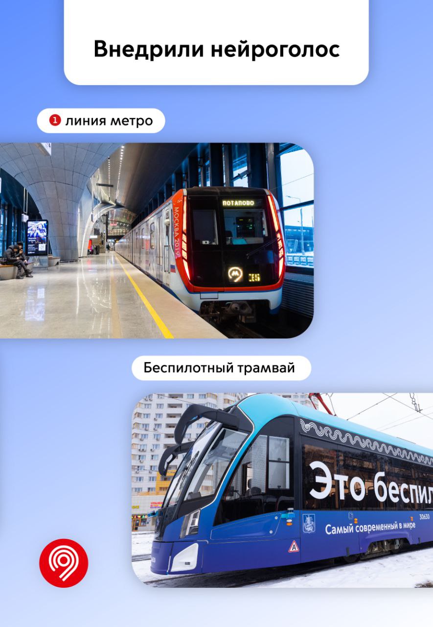🔹 Внедрили технологию нейроголоса. Отличить его от голосов дикторов Московского транспорта практически невозможно. Сегодня нейроголос звучит во всех поездах Сокольнической линии и в первом в России полностью беспилотном трамвае.